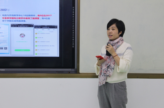 胡素君老师根据自己建设课程与开设在线课程的丰富经验,介绍了一门完整在线开放课程的建设内容及需要完成的工作,并针对每个环节总结可能遇见的问题与应注意的事项,为正在建设制作课程的教师提供了宝贵的经验。谢娜老师以在线课程《电路分析基础》为例,分享了自己运用“雨课堂”进行翻转课堂教学的心得与成功经验;李娟老师则以一堂生动的电路课演示了如何将“雨课堂”的功能恰到好处地应用到教学过程中的每个环节。培训结束后参会教师积极发言,针对在线课程建设与应用、“雨课堂”等相关的问题进行讨论与咨询。