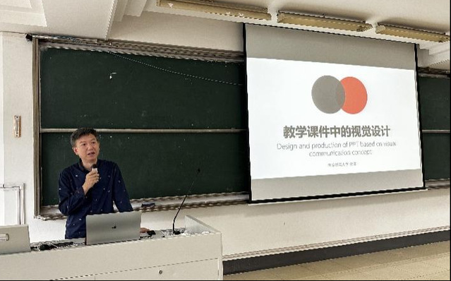 余洋教授紧密结合“金课”建设与教师教学竞赛,从设计美学的视角,以PPT制作理念与技巧为主题,阐述了如何通过PPT吸引学习者的注意力,提升课堂教学效果。他通过具体的案例,深入介绍了PPT设计与制作的几个原则,举例说明了PPT中图文的颜色、大小、比例等设计常识,强调了高质量的PPT在提升学生学习兴趣、提高课堂教学质量、增强课堂教学效果方面的重要作用。