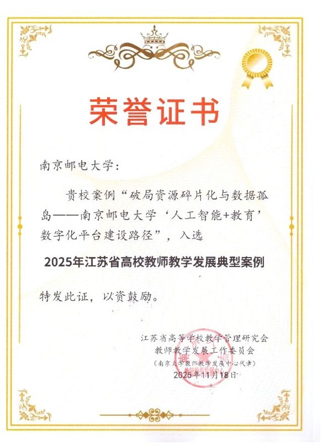 11月19日,江苏省高校教学管理研究会教学研究工作委员会暨第十一届江苏高校教师教学发展工作委员会学术年会在镇江举行。我校申报的《破局资源碎片化与数据孤岛——南京邮电大学“人工智能+教育”数字化平台建设路径》入选“江苏省高校教师教学发展典型案例征集活动”优秀案例。