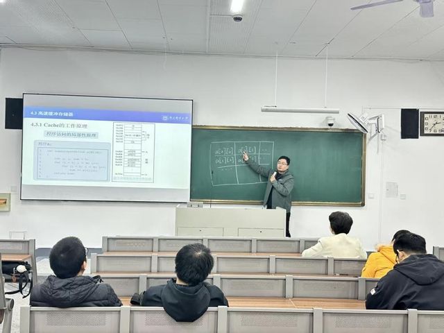 研讨会上,首先由青年教师王凯以“高速缓冲存储器”为教学主题展开试讲。他围绕高速缓冲存储器的基本原理、核心组成部件及关键性能指标三大模块,通过板书设计引导学生逐步梳理知识逻辑,从“是什么”“由什么构成”“如何衡量性能”三个维度层层递进,帮助学生建立对知识点的基础认知。整个教学过程中,王凯老师授课思路连贯,对教学内容的掌握扎实,展现出青年教师在教学设计与知识传递方面的潜力,也为后续教学改进留下了可优化空间。