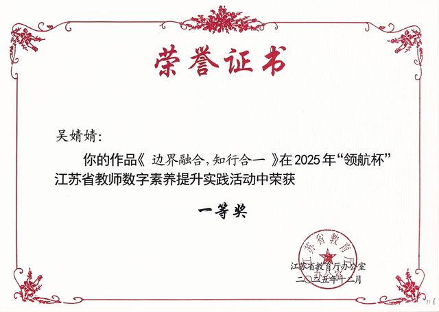 近日,江苏省教育网络安全和信息化领导小组办公室公布了2025年“领航杯”江苏省教师数字素养提升实践活动获奖名单。我校教师在此次活动中获奖2项,其中,特等奖1项,一等奖1项。